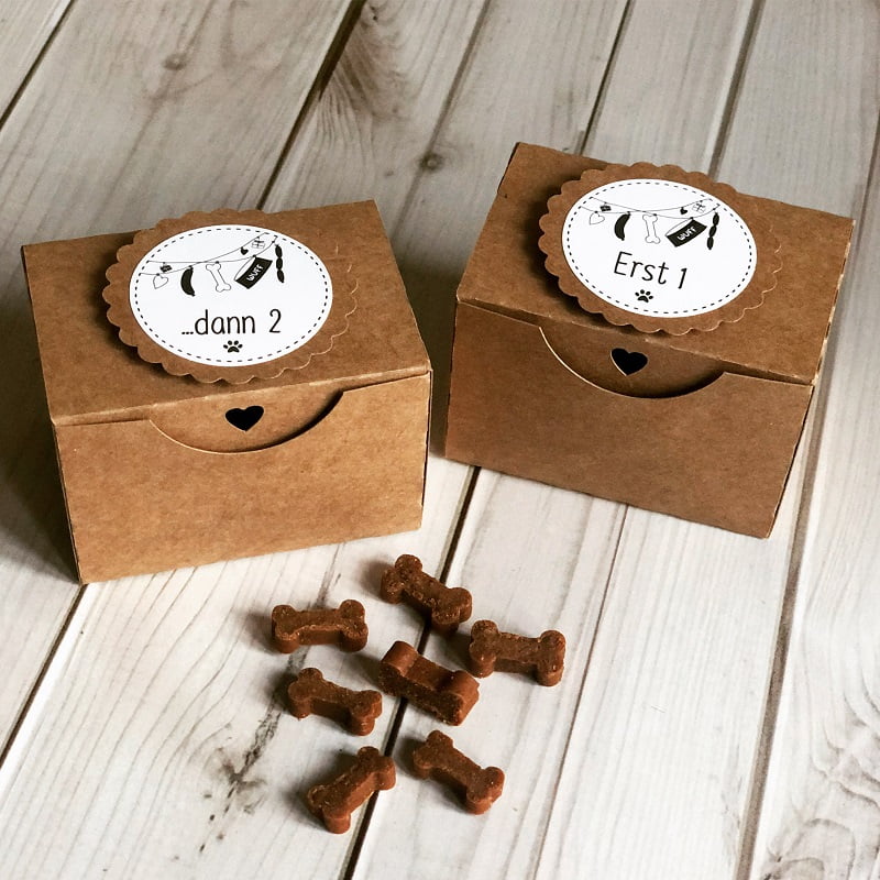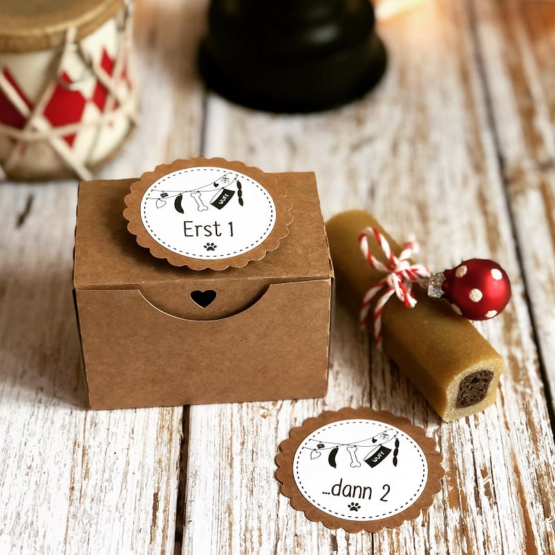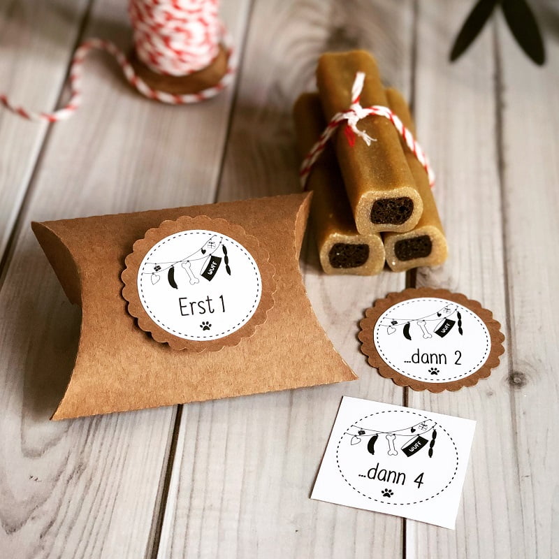 Eine herzliche Idee für alle Hunde und ihre Herrchen und Frauchen: Adventskalendersticker für die 4 Adventssonntage. Klebe sie auf kleine Boxen oder direkt auf das Hunde-Leckerli oder Spielzeug und versüsse Deinem Vierbeiner damit die Adventszeit. Die Aufkleber mit Knochen, Wurst und Napf allein sind schon ein Hingucker und auch eine tolle Geschenkidee für alle Hundeliebhaber in Deinem Familien- und Freundeskreis.