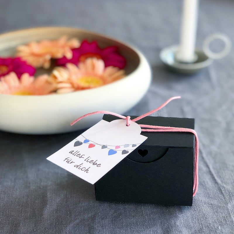 Eine herzige Box für liebevolle, kleine Geschenke. Der besondere Hingucker ist das kleine Herz, das in die Verschlusslasche gestanzt ist. Hierüber freuen sich nicht nur Verliebte! Die Schachteln lassen sich leicht und ganz ohne Klebstoff zusammenstecken und leicht befüllen. Wähle aus, ob Du die Schachtel in schwarz, weiss oder Kraftpapier haben möchtest.